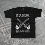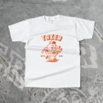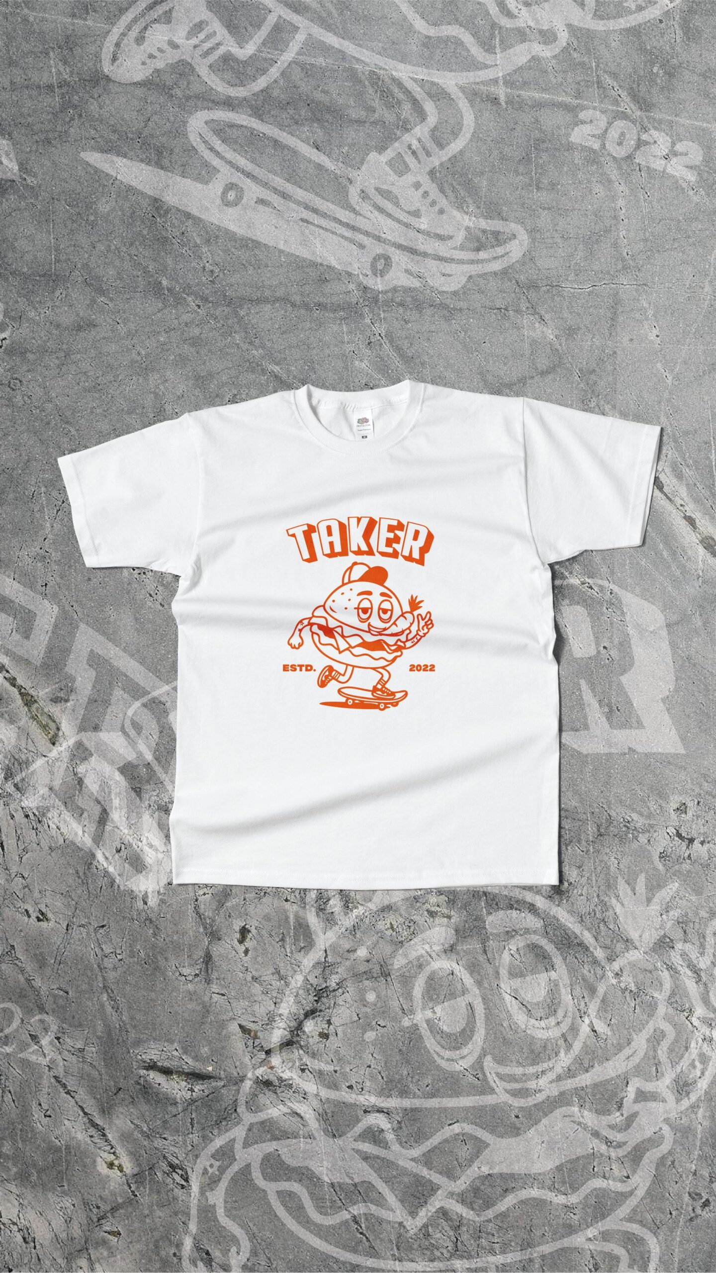 TAKER hardcore T-shirt with burger motive. White Guildan T-Shirt with orange print. Available in the sizes S-XXL.
